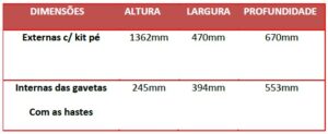 O peso recomendado por gaveta é de 45 kg bem distribuídos. A quantidade de pasta varia de 40 a 50 por gaveta. Segue tabela abaixo das dimensões do arquivo e gavetas:
