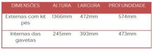 O peso recomendado por gaveta é de 25 kg bem distribuídos. A quantidade de pasta varia de 30 – 40 por gaveta. Segue tabela abaixo das dimensões do arquivo e gavetas: