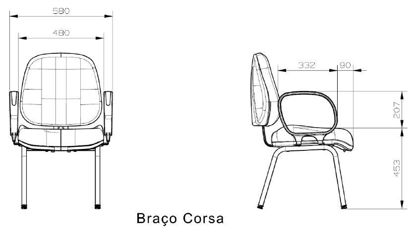 Braço Corsa c/ Prancheta: Consiste em uma estrutura em arco revestida em PU com uma prancheta escamoteável em fórmica branca, contendo duas flanges de aço em formato de “L” para a fixação no assento. Para montar o braço no assento, são utilizados 4 (quatro) parafusos sextavados (para cada braço) com as dimensões aproximadas de ¼” x 1.¼”.