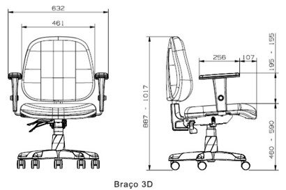 Braço 3D: Apoio de braço com 3 tipos de regulagem, sendo altura, avanço horizontal e giro sobre seu próprio eixo. A regulagem de altura se dá pelo pressionamento de um botão na lateral externa do apoio, já o avanço horizontal e o giro se dão de maneira simples, bastando que o usuário exerça força sobre o apoio e o posicione na posição desejada. Possui 70 mm de curso de regulagem de altura,