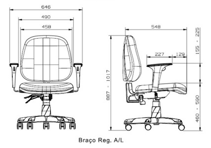 Braço Regulável: Apoio de braço em termoplástico de engenharia (Copolímero de Polipropileno) fabricado pelo processo de injeção, sendo que em suas propriedades mecânicas uma mistura de 30% de fibra de vidro é adicionada para dar maior resistência para a peça. Para a regulagem vertical do apoio deve-se pressionar o gatilho localizado na parte frontal, podendo o usuário escolher até 8 posições de ajuste, obtendo um curso de regulagem de até 70 mm. A chapa do braço é constituída de aço carbono ABNT 1008/1020 com 6,35 mm de espessura com seus cantos arredondados. Para montar o braço no assento, são utilizados 2 (dois) parafusos sextavados (para cada braço) com as dimensões aproximadas de