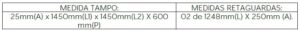 Tampo: Confeccionado em MDP BP (25mm) (Partículas de Média Densidade) fabricado através de partículas de madeira com resinas sintéticas (Ureia Formol), revestido por ambas as faces por uma folha celulósica decorativa banhada em solução melamínica fixada através de um processo de prensa de baixa pressão com acabamento em fita em PVC (poliestireno) com 2mm espessura com bordas aparentes.