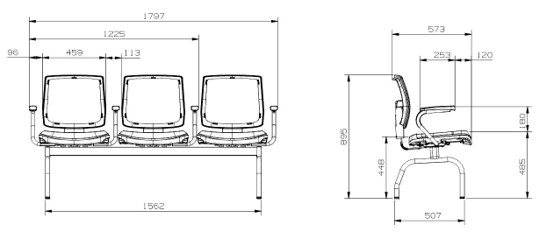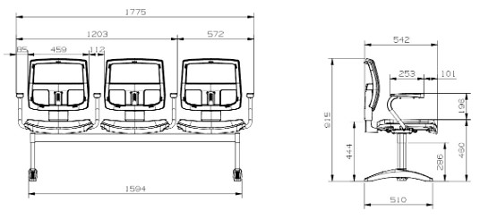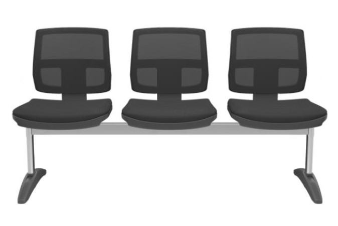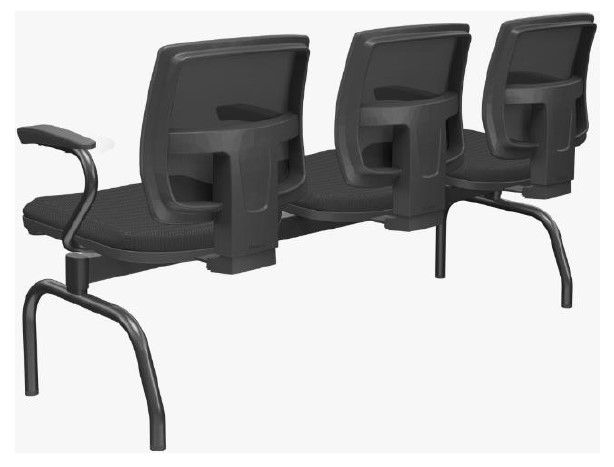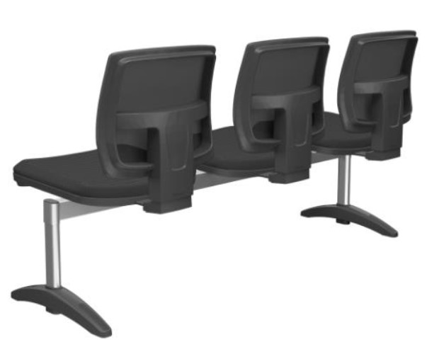 Conjunto montado sobre longarina de dois a cinco lugares, dispostos simetricamente de maneira a se obter a acomodação dos usuários de forma ergonômica e confortável.