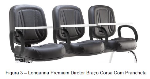 Braço Corsa c/ Prancheta: Consiste em uma estrutura em arco revestida em PU com uma prancheta escamoteável em fórmica branca, contendo duas flanges de aço em formato de “L” para a fixação no assento. Para montar o braço no assento, são utilizados 4 (quatro) parafusos sextavados (para cada braço) com as dimensões aproximadas de ¼” x 1”.