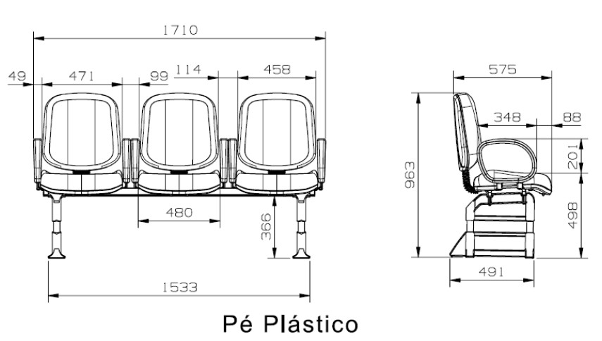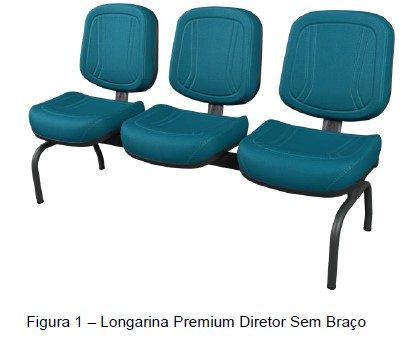 Conjunto montado sobre Longarinas de 2 (dois) a 5 (cinco) lugares, dispostos simetricamente de maneira a se obter uma acomodação de 2 (dois) a 5 (cinco) usuários de forma ergonômica, confortável e com alto grau de liberdade para movimentação.