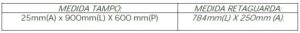 Tampo: Confeccionado em MDP BP (25mm) (Partículas de Média Densidade) fabricado através de partículas de madeira com resinas sintéticas (Ureia Formol), revestido por ambas as faces por uma folha celulósica decorativa banhada em solução melamínica fixada através de um processo de prensa de baixa pressão com acabamento em fita em PVC (poliestireno) com 2mm espessura com bordas aparentes.